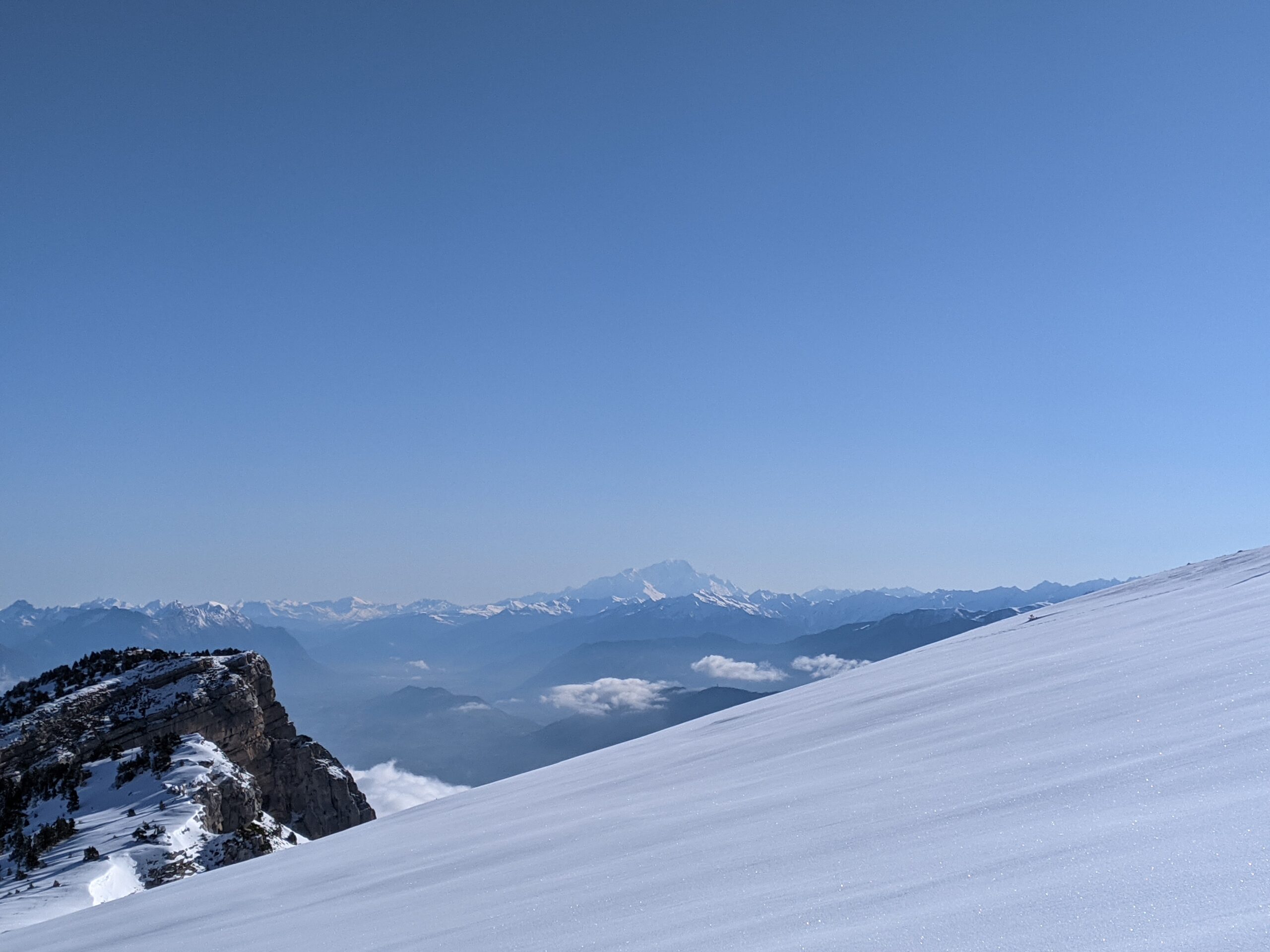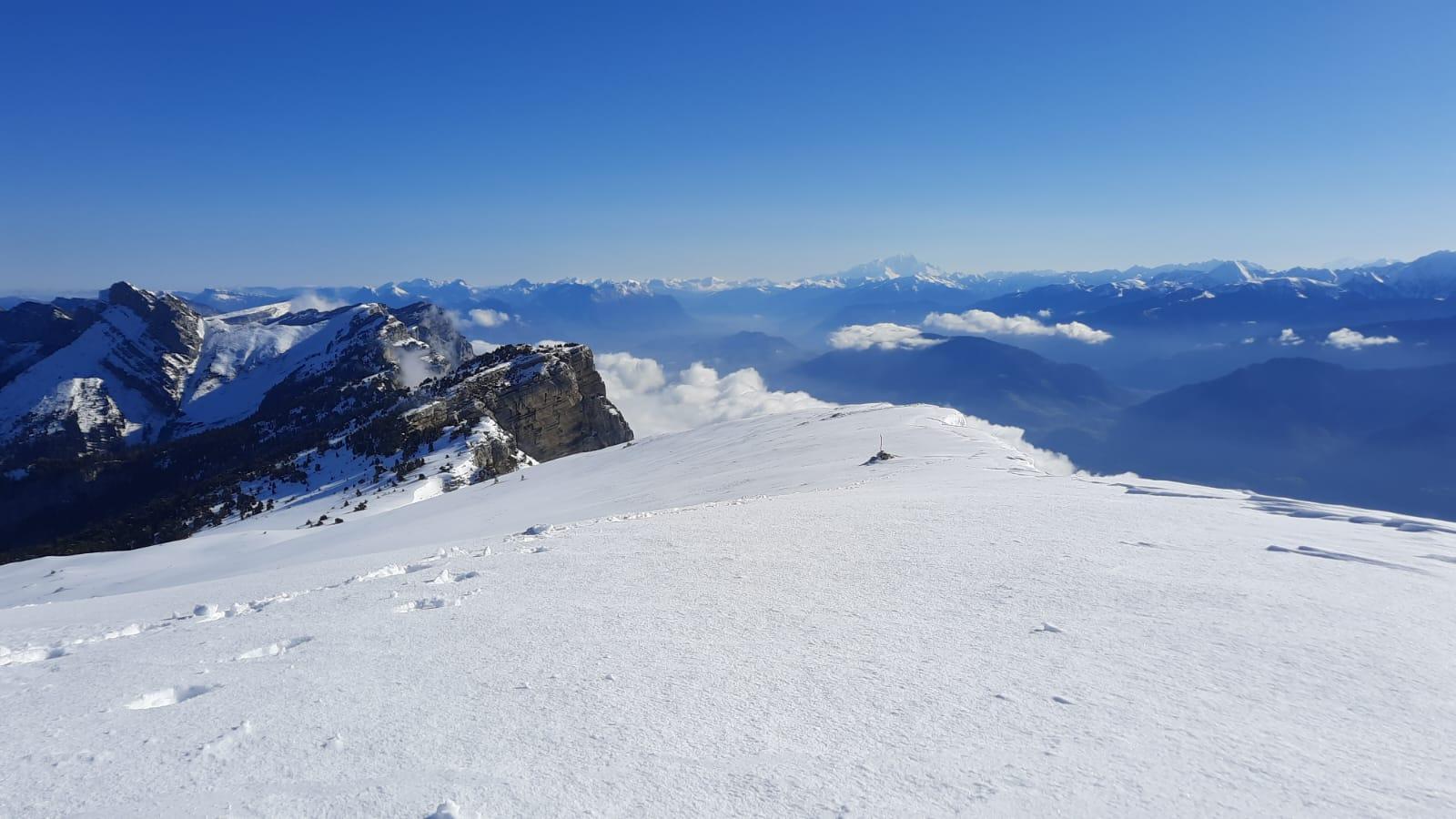 Mi avril, nous sommes partis du Col du Coq (20 mn de voiture). La montée et la descente par l’itinéraire du Trou du Glaz, plus faciles bien qu’un peu plus longues, sont conseillées par temps de neige. Nous attendaient au sommet une vue superbe sur la plupart des Alpes, dont le majestueux Mont Blanc… et des wingsuiters, attendant la dissipation des nuages de vallée pour sauter !
