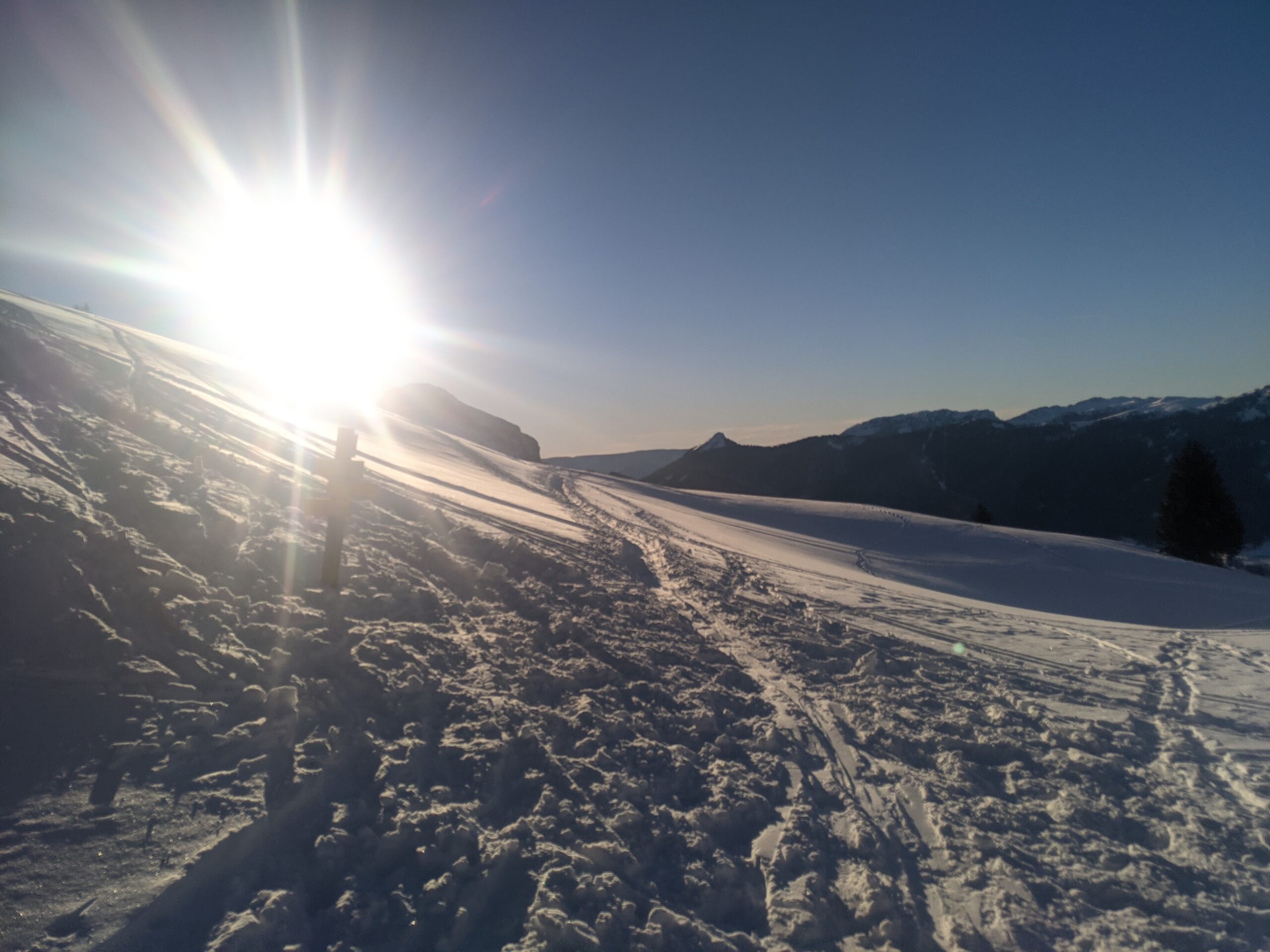 La montée au col du Coq par la route est facile, que l’on soit en skis de randonnée, en raquettes ou à pied, car la neige est tassée par tous les marcheurs des jours précédents, sauf si chute abondante récente.